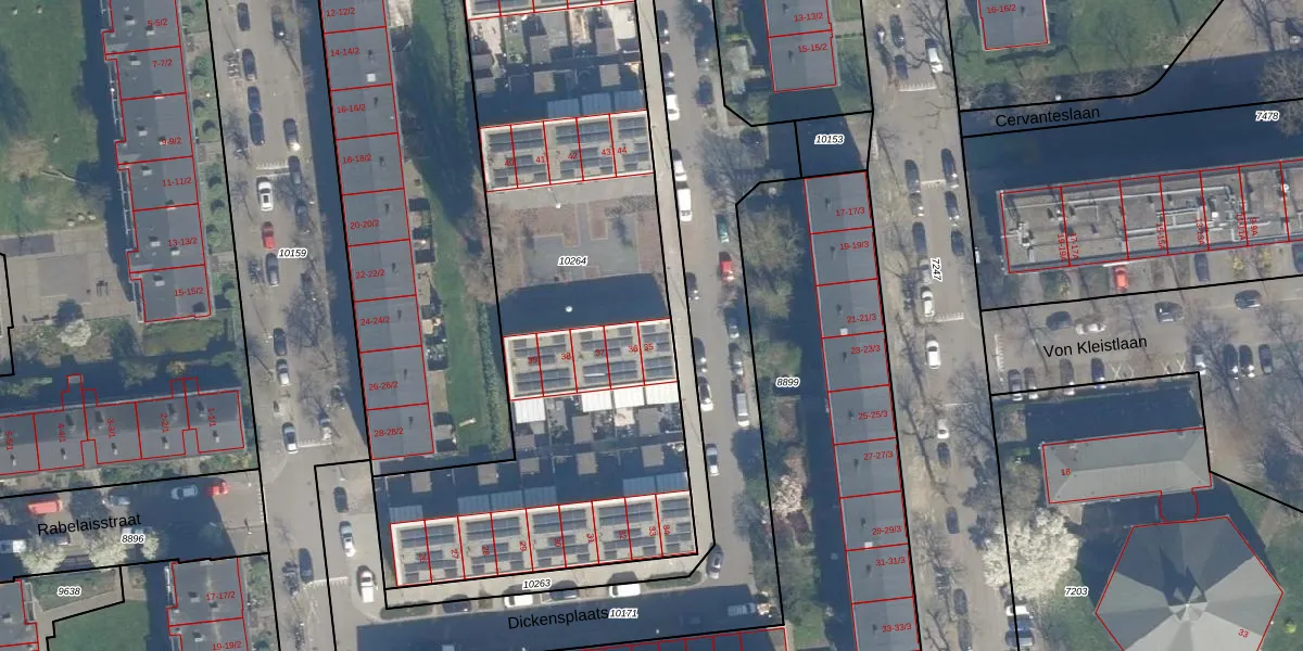 Het perceel waarop Dickensplaats 35 staat heeft een oppervlakte van 3347 m². Dit is een zeer groot perceel. De perceeloppervlakte wordt geregistreerd door het Kadaster. Gedetailleerde informatie over de maten van dit perceel kunt u vinden in het rapport Kadastrale kaart met maatvoering van Dickensplaats 35.