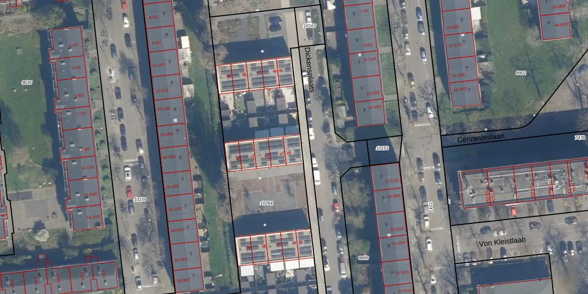 Het perceel waarop Dickensplaats 44 staat heeft een oppervlakte van 3347 m². Dit is een zeer groot perceel. De perceeloppervlakte wordt geregistreerd door het Kadaster. Gedetailleerde informatie over de maten van dit perceel kunt u vinden in het rapport Kadastrale kaart met maatvoering van Dickensplaats 44.