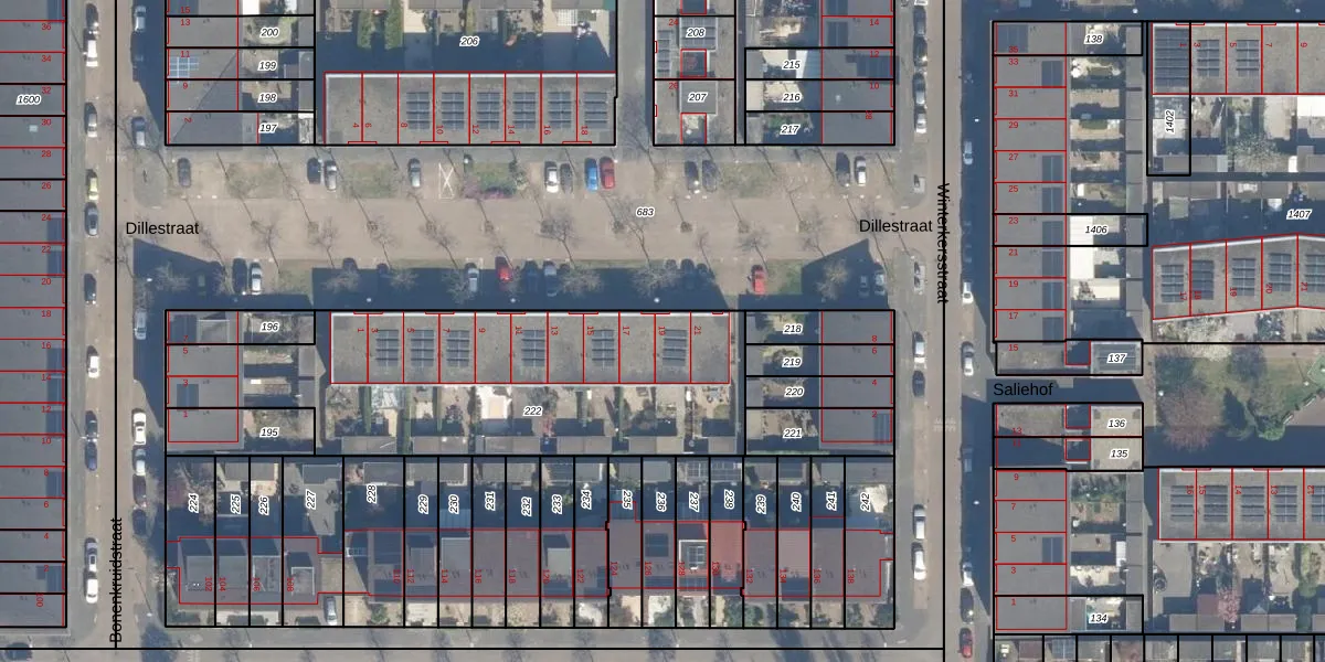 Het perceel waarop Dillestraat 19 staat heeft een oppervlakte van 1646 m². Dit is een zeer groot perceel. De perceeloppervlakte wordt geregistreerd door het Kadaster. Gedetailleerde informatie over de maten van dit perceel kunt u vinden in het rapport Kadastrale kaart met maatvoering van Dillestraat 19.