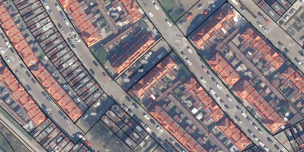 Het perceel waarop Distelstraat 20 staat heeft een oppervlakte van 2851 m². Dit is een zeer groot perceel. De perceeloppervlakte wordt geregistreerd door het Kadaster. Gedetailleerde informatie over de maten van dit perceel kunt u vinden in het rapport Kadastrale kaart met maatvoering van Distelstraat 20.