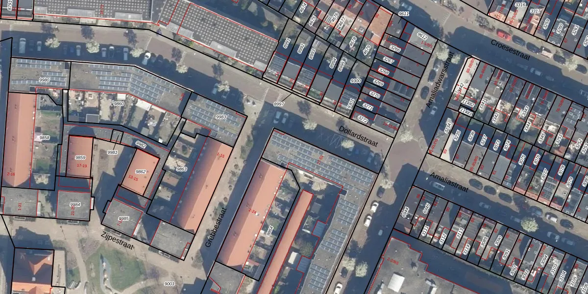 Het perceel waarop Dollardstraat 39 staat heeft een oppervlakte van 3385 m². Dit is een zeer groot perceel. De perceeloppervlakte wordt geregistreerd door het Kadaster. Gedetailleerde informatie over de maten van dit perceel kunt u vinden in het rapport Kadastrale kaart met maatvoering van Dollardstraat 39.