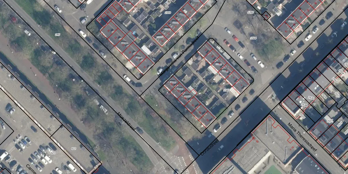 Het perceel waarop Donaudreef 63 staat heeft een oppervlakte van 1509 m². Dit is een zeer groot perceel. De perceeloppervlakte wordt geregistreerd door het Kadaster. Gedetailleerde informatie over de maten van dit perceel kunt u vinden in het rapport Kadastrale kaart met maatvoering van Donaudreef 63.