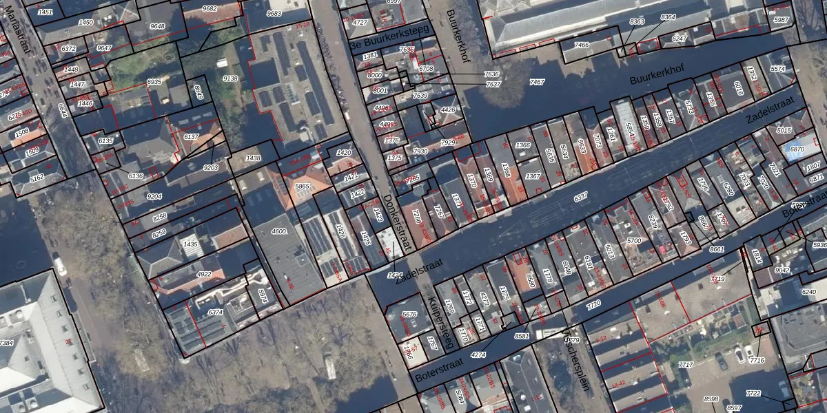 Het perceel waarop Donkerstraat 28-A staat heeft een oppervlakte van 88 m². Dit is een klein perceel. De perceeloppervlakte wordt geregistreerd door het Kadaster. Gedetailleerde informatie over de maten van dit perceel kunt u vinden in het rapport Kadastrale kaart met maatvoering van Donkerstraat 28-A.