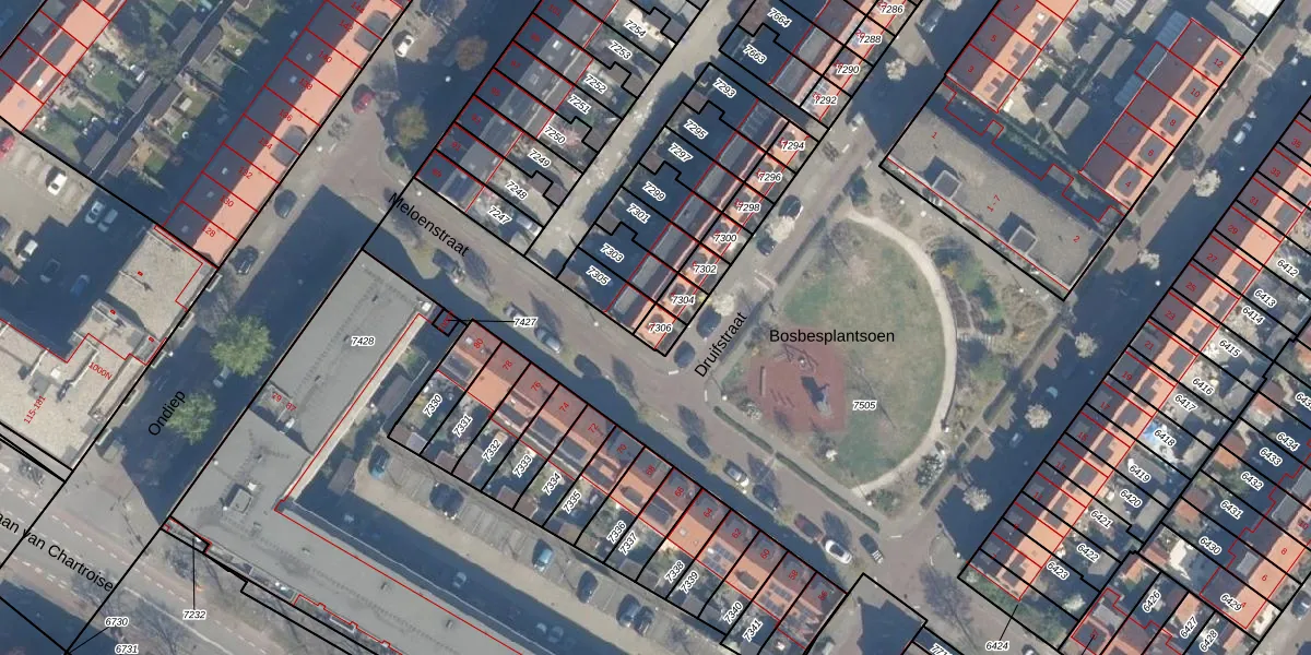 Het perceel waarop Druifstraat 2 staat heeft een oppervlakte van 35 m². Dit is een klein perceel. De perceeloppervlakte wordt geregistreerd door het Kadaster. Gedetailleerde informatie over de maten van dit perceel kunt u vinden in het rapport Kadastrale kaart met maatvoering van Druifstraat 2.