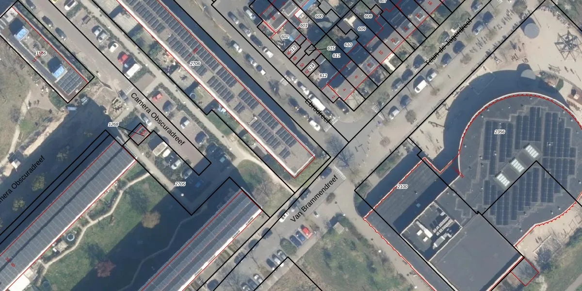 Het perceel waarop Ebrodreef 101 staat heeft een oppervlakte van 2179 m². Dit is een zeer groot perceel. De perceeloppervlakte wordt geregistreerd door het Kadaster. Gedetailleerde informatie over de maten van dit perceel kunt u vinden in het rapport Kadastrale kaart met maatvoering van Ebrodreef 101.
