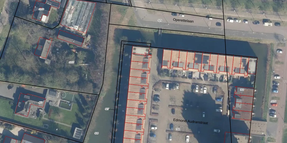 Het perceel waarop Edmond Audranstraat 39 staat heeft een oppervlakte van 8100 m². Dit is een zeer groot perceel. De perceeloppervlakte wordt geregistreerd door het Kadaster. Gedetailleerde informatie over de maten van dit perceel kunt u vinden in het rapport Kadastrale kaart met maatvoering van Edmond Audranstraat 39.