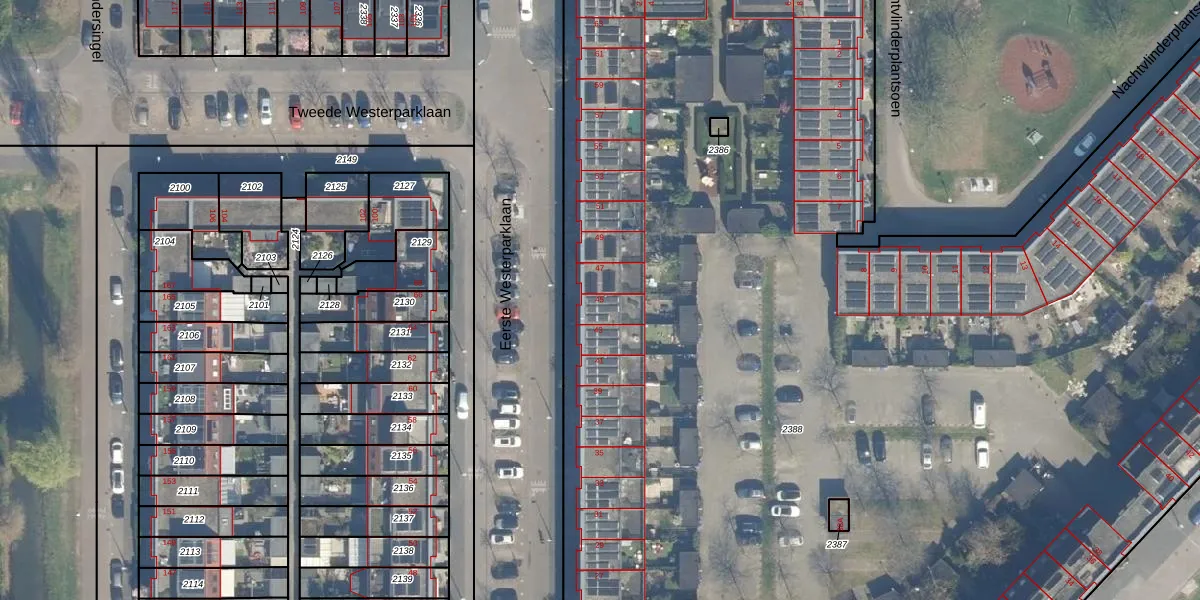 Het perceel waarop Eerste Westerparklaan 45 staat heeft een oppervlakte van 1,3 ha. Dit is een zeer groot perceel. De perceeloppervlakte wordt geregistreerd door het Kadaster. Gedetailleerde informatie over de maten van dit perceel kunt u vinden in het rapport Kadastrale kaart met maatvoering van Eerste Westerparklaan 45.