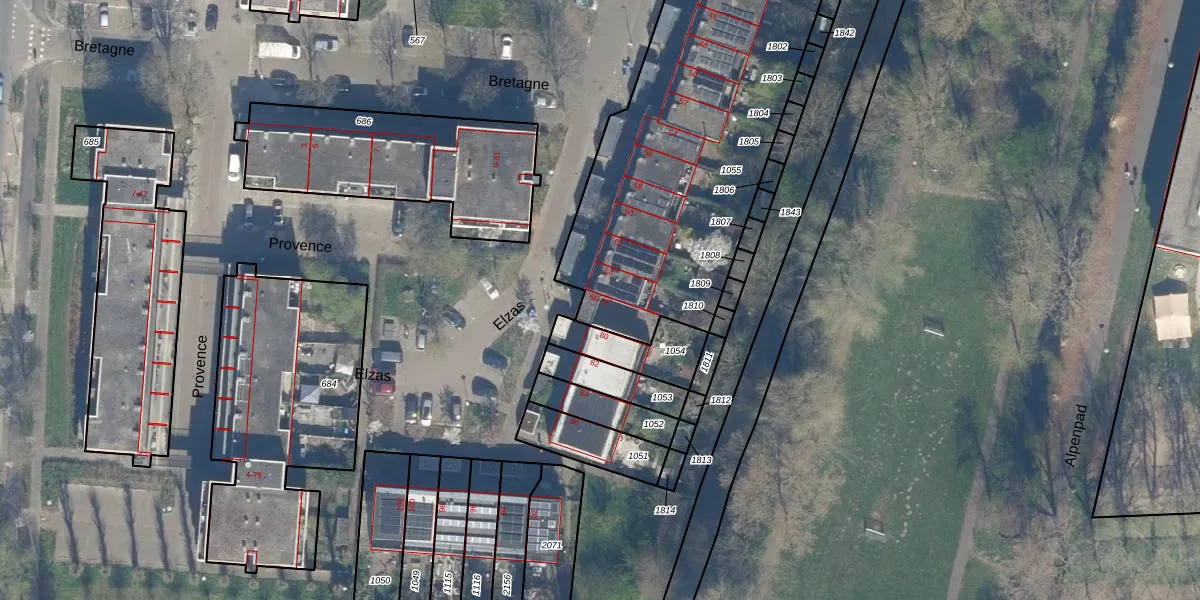 Het perceel waarop Elzas 76 staat heeft een oppervlakte van 1977 m². Dit is een zeer groot perceel. De perceeloppervlakte wordt geregistreerd door het Kadaster. Gedetailleerde informatie over de maten van dit perceel kunt u vinden in het rapport Kadastrale kaart met maatvoering van Elzas 76.