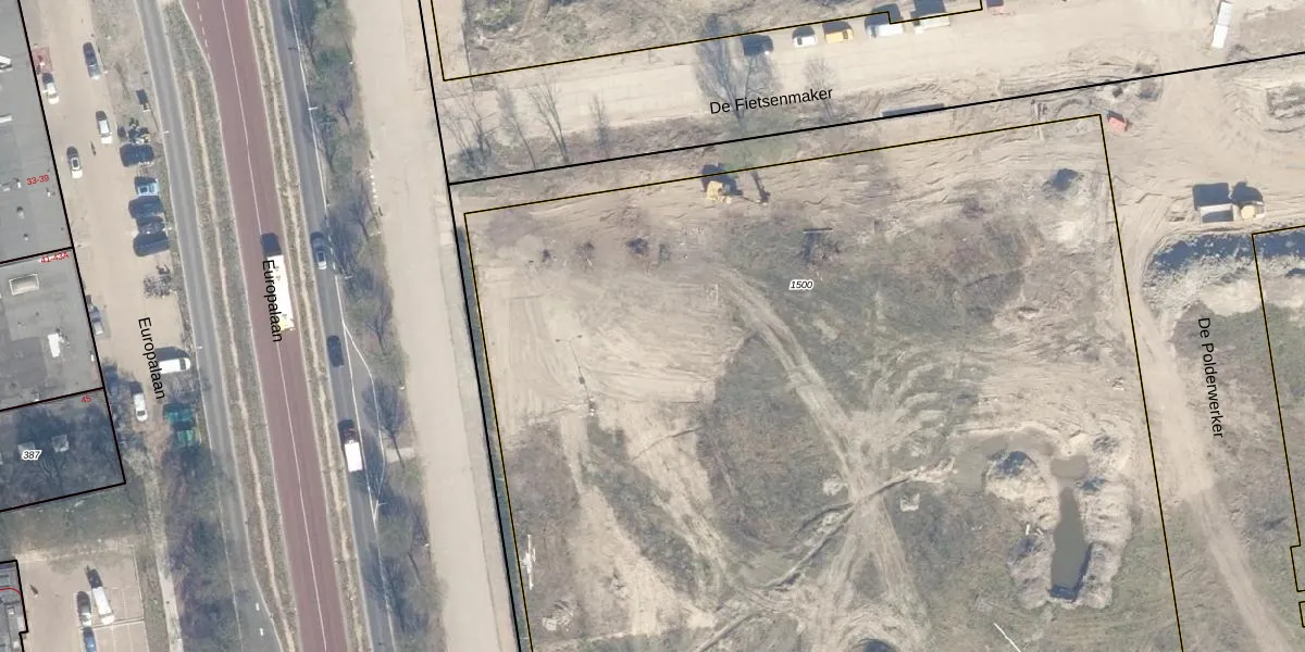 Het perceel waarop Europalaan 8-90 staat heeft een oppervlakte van 9430 m². Dit is een zeer groot perceel. De perceeloppervlakte wordt geregistreerd door het Kadaster. Gedetailleerde informatie over de maten van dit perceel kunt u vinden in het rapport Kadastrale kaart met maatvoering van Europalaan 8-90.