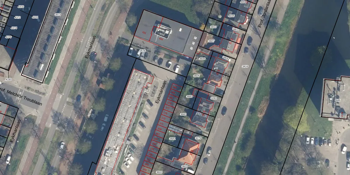 Het perceel waarop Eykmanlaan 185 staat heeft een oppervlakte van 9087 m². Dit is een zeer groot perceel. De perceeloppervlakte wordt geregistreerd door het Kadaster. Gedetailleerde informatie over de maten van dit perceel kunt u vinden in het rapport Kadastrale kaart met maatvoering van Eykmanlaan 185.