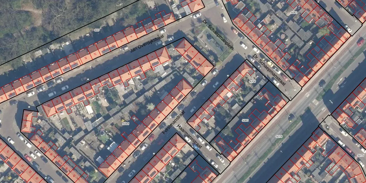 Het perceel waarop Forstmanstraat 1 staat heeft een oppervlakte van 4102 m². Dit is een zeer groot perceel. De perceeloppervlakte wordt geregistreerd door het Kadaster. Gedetailleerde informatie over de maten van dit perceel kunt u vinden in het rapport Kadastrale kaart met maatvoering van Forstmanstraat 1.