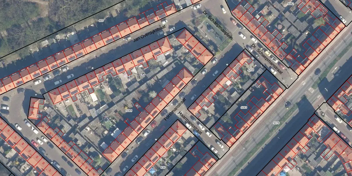 Het perceel waarop Forstmanstraat 5 staat heeft een oppervlakte van 4102 m². Dit is een zeer groot perceel. De perceeloppervlakte wordt geregistreerd door het Kadaster. Gedetailleerde informatie over de maten van dit perceel kunt u vinden in het rapport Kadastrale kaart met maatvoering van Forstmanstraat 5.