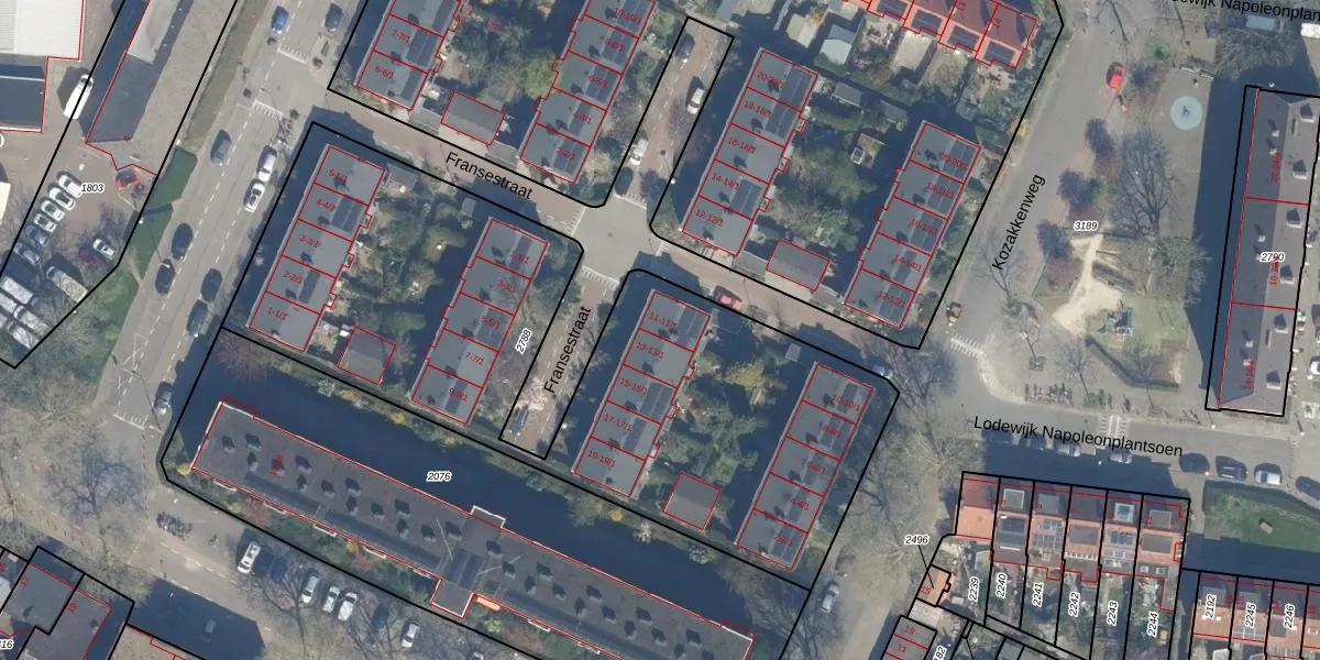 Het perceel waarop Fransestraat 11 staat heeft een oppervlakte van 3020 m². Dit is een zeer groot perceel. De perceeloppervlakte wordt geregistreerd door het Kadaster. Gedetailleerde informatie over de maten van dit perceel kunt u vinden in het rapport Kadastrale kaart met maatvoering van Fransestraat 11.