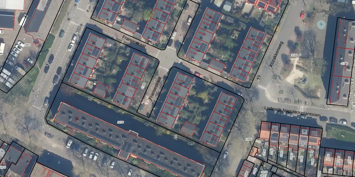 Het perceel waarop Fransestraat 13-1 staat heeft een oppervlakte van 3020 m². Dit is een zeer groot perceel. De perceeloppervlakte wordt geregistreerd door het Kadaster. Gedetailleerde informatie over de maten van dit perceel kunt u vinden in het rapport Kadastrale kaart met maatvoering van Fransestraat 13-1.