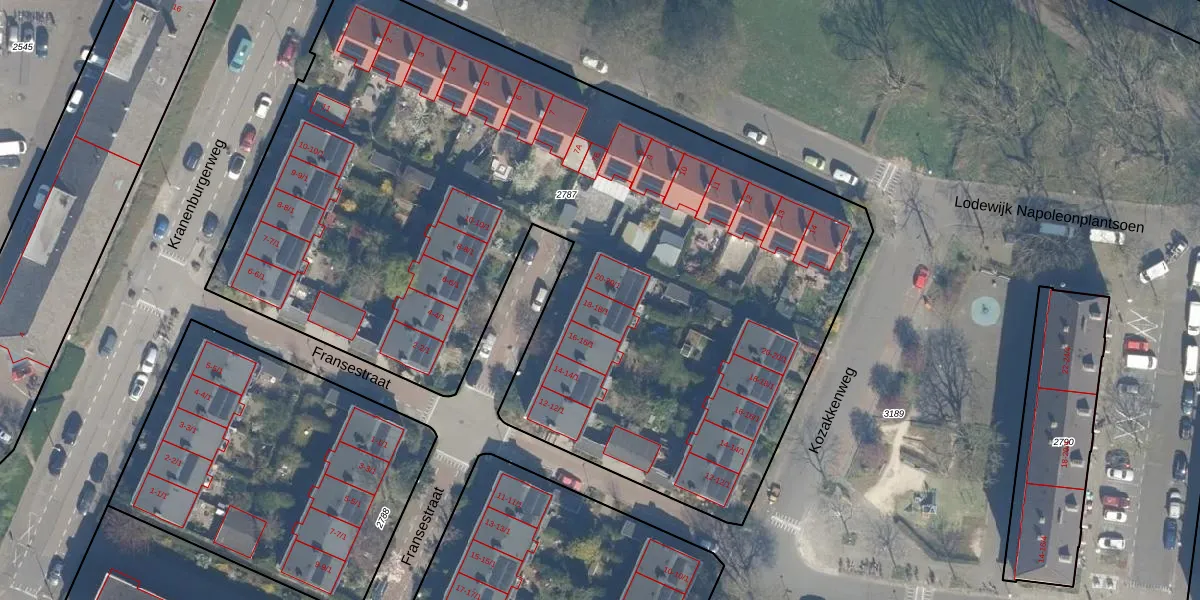 Het perceel waarop Fransestraat 18 staat heeft een oppervlakte van 5265 m². Dit is een zeer groot perceel. De perceeloppervlakte wordt geregistreerd door het Kadaster. Gedetailleerde informatie over de maten van dit perceel kunt u vinden in het rapport Kadastrale kaart met maatvoering van Fransestraat 18.