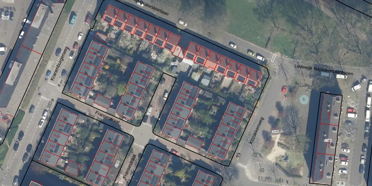 Het perceel waarop Fransestraat 20 staat heeft een oppervlakte van 5265 m². Dit is een zeer groot perceel. De perceeloppervlakte wordt geregistreerd door het Kadaster. Gedetailleerde informatie over de maten van dit perceel kunt u vinden in het rapport Kadastrale kaart met maatvoering van Fransestraat 20.