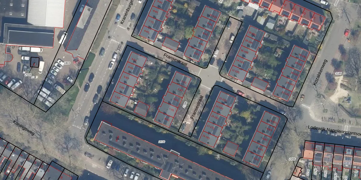 Het perceel waarop Fransestraat 3-1 staat heeft een oppervlakte van 3020 m². Dit is een zeer groot perceel. De perceeloppervlakte wordt geregistreerd door het Kadaster. Gedetailleerde informatie over de maten van dit perceel kunt u vinden in het rapport Kadastrale kaart met maatvoering van Fransestraat 3-1.