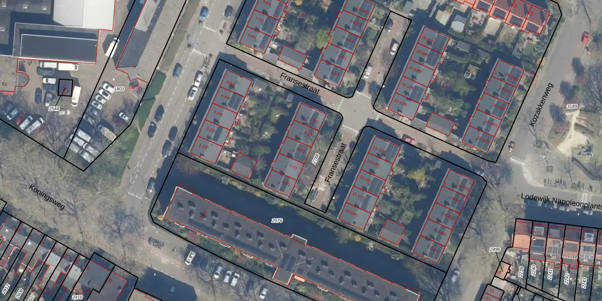 Het perceel waarop Fransestraat 5-1 staat heeft een oppervlakte van 3020 m². Dit is een zeer groot perceel. De perceeloppervlakte wordt geregistreerd door het Kadaster. Gedetailleerde informatie over de maten van dit perceel kunt u vinden in het rapport Kadastrale kaart met maatvoering van Fransestraat 5-1.