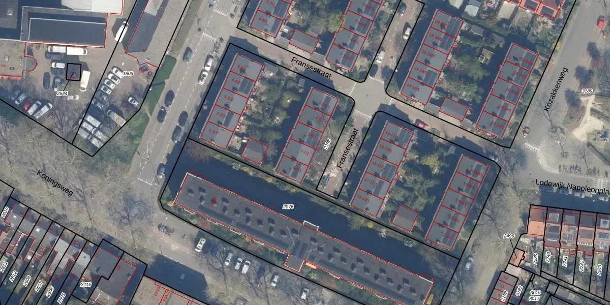 Het perceel waarop Fransestraat 7-1 staat heeft een oppervlakte van 3020 m². Dit is een zeer groot perceel. De perceeloppervlakte wordt geregistreerd door het Kadaster. Gedetailleerde informatie over de maten van dit perceel kunt u vinden in het rapport Kadastrale kaart met maatvoering van Fransestraat 7-1.