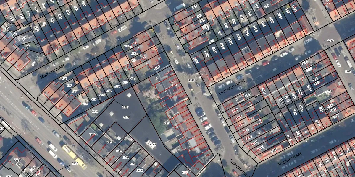 Het perceel waarop Galvanistraat 20-BS staat heeft een oppervlakte van 1305 m². Dit is een zeer groot perceel. De perceeloppervlakte wordt geregistreerd door het Kadaster. Gedetailleerde informatie over de maten van dit perceel kunt u vinden in het rapport Kadastrale kaart met maatvoering van Galvanistraat 20-BS.