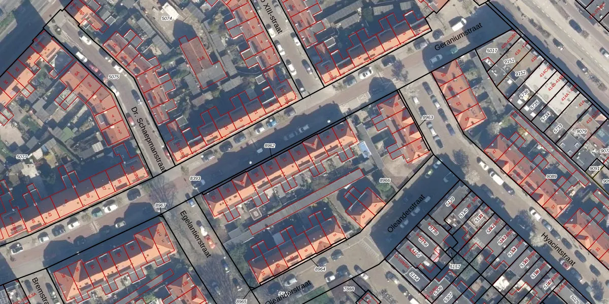 Het perceel waarop Geraniumstraat 10 staat heeft een oppervlakte van 2419 m². Dit is een zeer groot perceel. De perceeloppervlakte wordt geregistreerd door het Kadaster. Gedetailleerde informatie over de maten van dit perceel kunt u vinden in het rapport Kadastrale kaart met maatvoering van Geraniumstraat 10.
