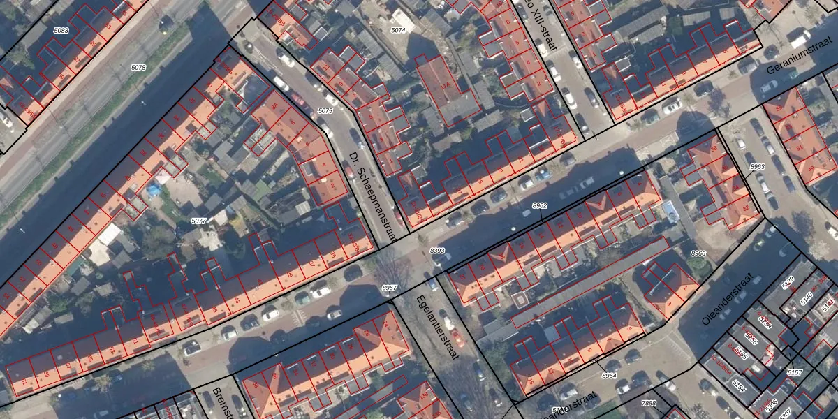 Het perceel waarop Geraniumstraat 31-BS staat heeft een oppervlakte van 3220 m². Dit is een zeer groot perceel. De perceeloppervlakte wordt geregistreerd door het Kadaster. Gedetailleerde informatie over de maten van dit perceel kunt u vinden in het rapport Kadastrale kaart met maatvoering van Geraniumstraat 31-BS.
