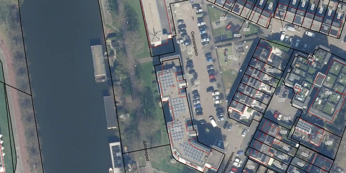 Het perceel waarop Giessenplein 55 staat heeft een oppervlakte van 1210 m². Dit is een zeer groot perceel. De perceeloppervlakte wordt geregistreerd door het Kadaster. Gedetailleerde informatie over de maten van dit perceel kunt u vinden in het rapport Kadastrale kaart met maatvoering van Giessenplein 55.