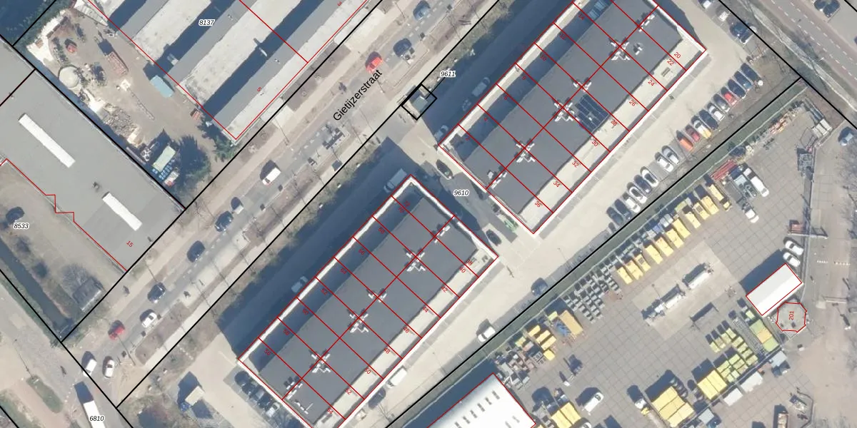 Het perceel waarop Gietijzerstraat 72 staat heeft een oppervlakte van 9062 m². Dit is een zeer groot perceel. De perceeloppervlakte wordt geregistreerd door het Kadaster. Gedetailleerde informatie over de maten van dit perceel kunt u vinden in het rapport Kadastrale kaart met maatvoering van Gietijzerstraat 72.