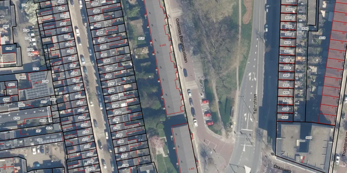 Het perceel waarop Goeman Borgesiuslaan 6 staat heeft een oppervlakte van 4040 m². Dit is een zeer groot perceel. De perceeloppervlakte wordt geregistreerd door het Kadaster. Gedetailleerde informatie over de maten van dit perceel kunt u vinden in het rapport Kadastrale kaart met maatvoering van Goeman Borgesiuslaan 6.