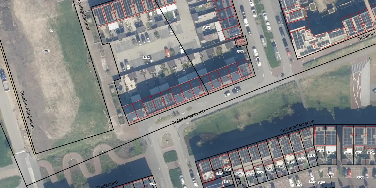 Het perceel waarop Guldenplantsoen 14 staat heeft een oppervlakte van 2465 m². Dit is een zeer groot perceel. De perceeloppervlakte wordt geregistreerd door het Kadaster. Gedetailleerde informatie over de maten van dit perceel kunt u vinden in het rapport Kadastrale kaart met maatvoering van Guldenplantsoen 14.