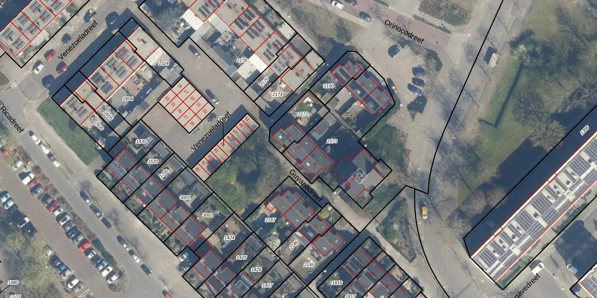 Het perceel waarop Guyanadreef 21 staat heeft een oppervlakte van 874 m². Dit is een groot perceel. De perceeloppervlakte wordt geregistreerd door het Kadaster. Gedetailleerde informatie over de maten van dit perceel kunt u vinden in het rapport Kadastrale kaart met maatvoering van Guyanadreef 21.