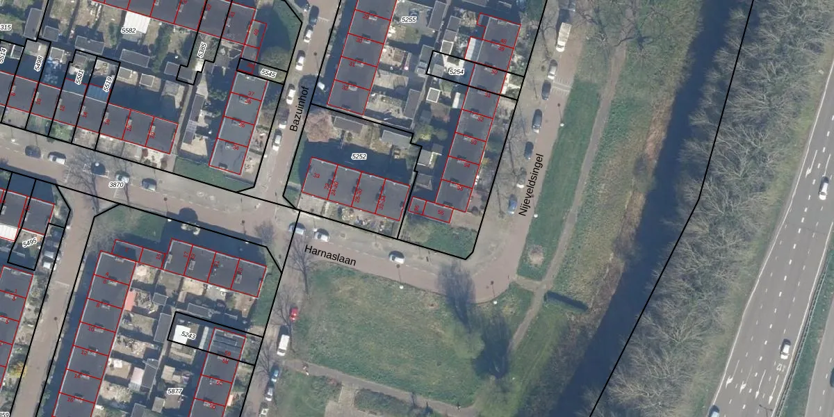 Het perceel waarop Harnaslaan 36 staat heeft een oppervlakte van 2870 m². Dit is een zeer groot perceel. De perceeloppervlakte wordt geregistreerd door het Kadaster. Gedetailleerde informatie over de maten van dit perceel kunt u vinden in het rapport Kadastrale kaart met maatvoering van Harnaslaan 36.