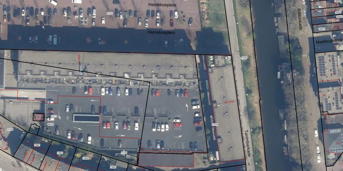 Het perceel waarop Haroekoeplein 114 staat heeft een oppervlakte van 2905 m². Dit is een zeer groot perceel. De perceeloppervlakte wordt geregistreerd door het Kadaster. Gedetailleerde informatie over de maten van dit perceel kunt u vinden in het rapport Kadastrale kaart met maatvoering van Haroekoeplein 114.