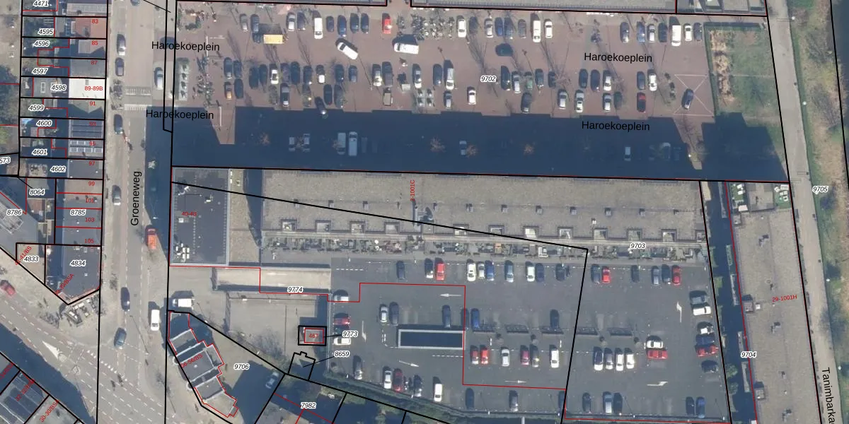 Het perceel waarop Haroekoeplein 46 staat heeft een oppervlakte van 2905 m². Dit is een zeer groot perceel. De perceeloppervlakte wordt geregistreerd door het Kadaster. Gedetailleerde informatie over de maten van dit perceel kunt u vinden in het rapport Kadastrale kaart met maatvoering van Haroekoeplein 46.