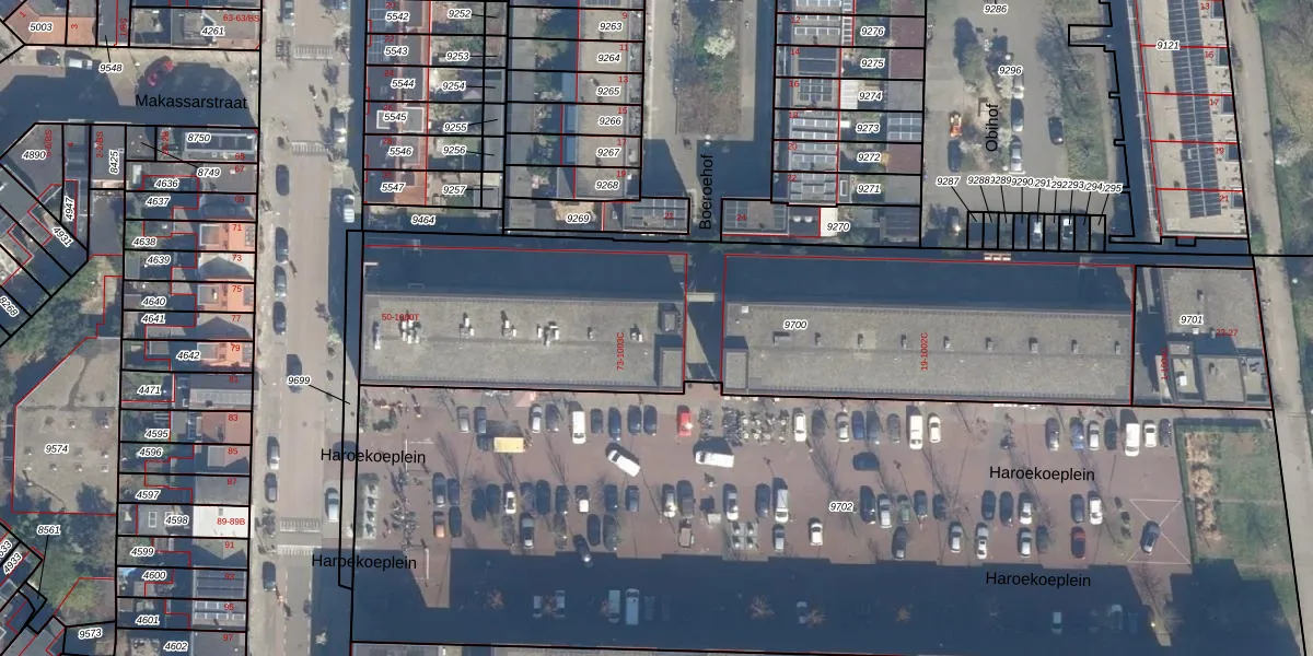 Haroekoeplein 77 is gelegen op kadastraal perceel CTR00C9700. Deze kadastrale aanduiding is uniek en wordt gebruikt door het Kadaster om eigendomsrechten en andere zakelijke rechten vast te leggen. Het perceel maakt onderdeel uit van de kadastrale gemeente Catharijne.