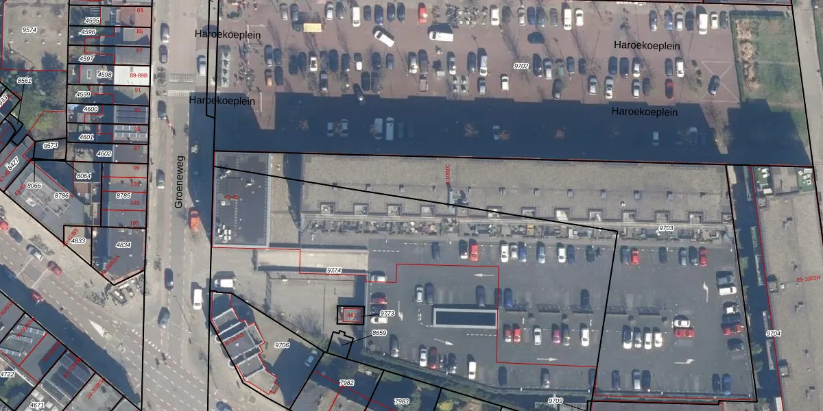 Het perceel waarop Haroekoeplein 94 staat heeft een oppervlakte van 4015 m². Dit is een zeer groot perceel. De perceeloppervlakte wordt geregistreerd door het Kadaster. Gedetailleerde informatie over de maten van dit perceel kunt u vinden in het rapport Kadastrale kaart met maatvoering van Haroekoeplein 94.