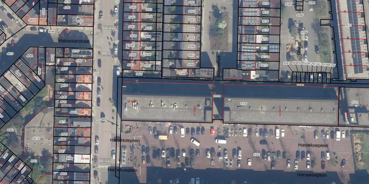 Het perceel waarop Haroekoeplein 99 staat heeft een oppervlakte van 2760 m². Dit is een zeer groot perceel. De perceeloppervlakte wordt geregistreerd door het Kadaster. Gedetailleerde informatie over de maten van dit perceel kunt u vinden in het rapport Kadastrale kaart met maatvoering van Haroekoeplein 99.