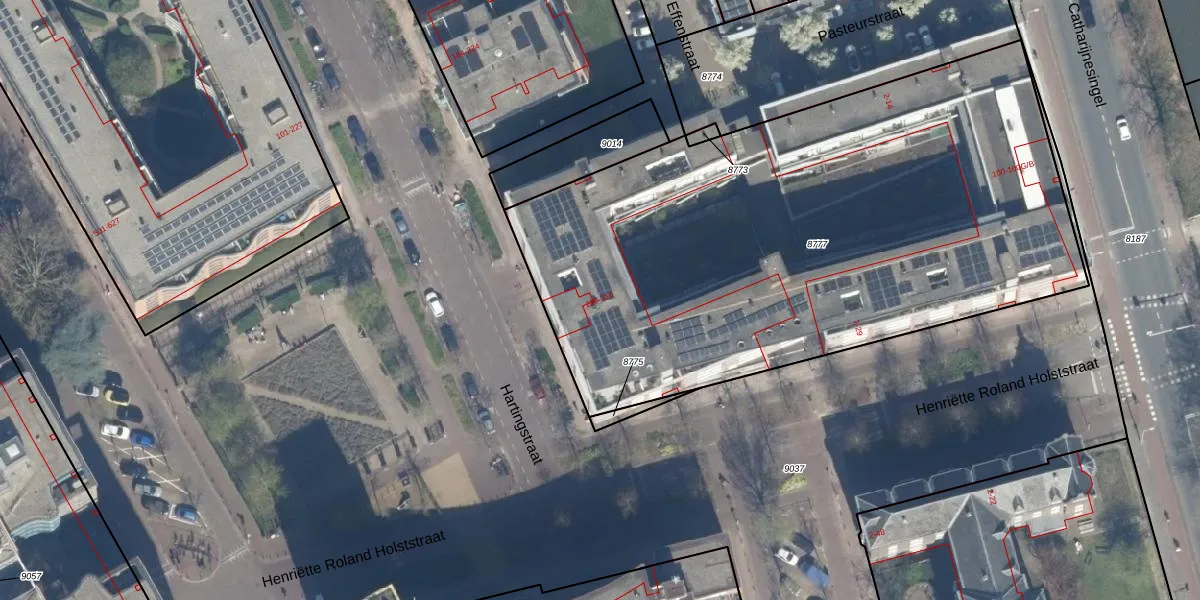 Het adres is gelegen op perceel 8777 in de sectie D en de kadastrale gemeente Catharijne. De kadastrale aanduiding is aldus CTR00-D-8777. Het perceel is met 3570 m² relatief groot. Het gemiddelde ligt in de kadastrale gemeente Catharijne op 828,3 m². De grootste perceeloppervlakte in de kadastrale gemeente is 35,6 ha. De kleinste oppervlakte bedraagt 0 m². Op het perceel zijn 105 adressen aanwezig. De huidige grenzen van het perceel zijn digitaal in de Basisregistratie Kadaster (BRK) geregistreerd op 10-05-1999.