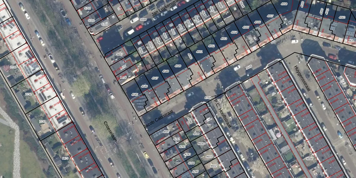 Jacob Catsstraat 33-BS is gelegen op kadastraal perceel CTR00D4548. Deze kadastrale aanduiding is uniek en wordt gebruikt door het Kadaster om eigendomsrechten en andere zakelijke rechten vast te leggen. Het perceel maakt onderdeel uit van de kadastrale gemeente Catharijne.