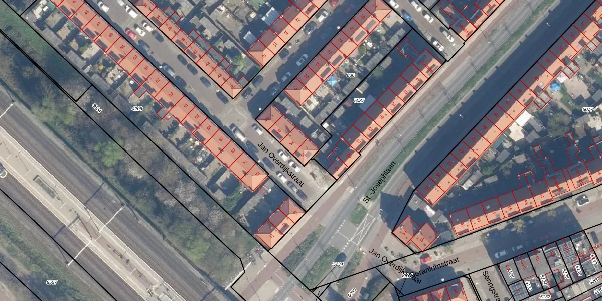 Het perceel waarop Jan Overdijkstraat 54 staat heeft een oppervlakte van 1080 m². Dit is een zeer groot perceel. De perceeloppervlakte wordt geregistreerd door het Kadaster. Gedetailleerde informatie over de maten van dit perceel kunt u vinden in het rapport Kadastrale kaart met maatvoering van Jan Overdijkstraat 54.
