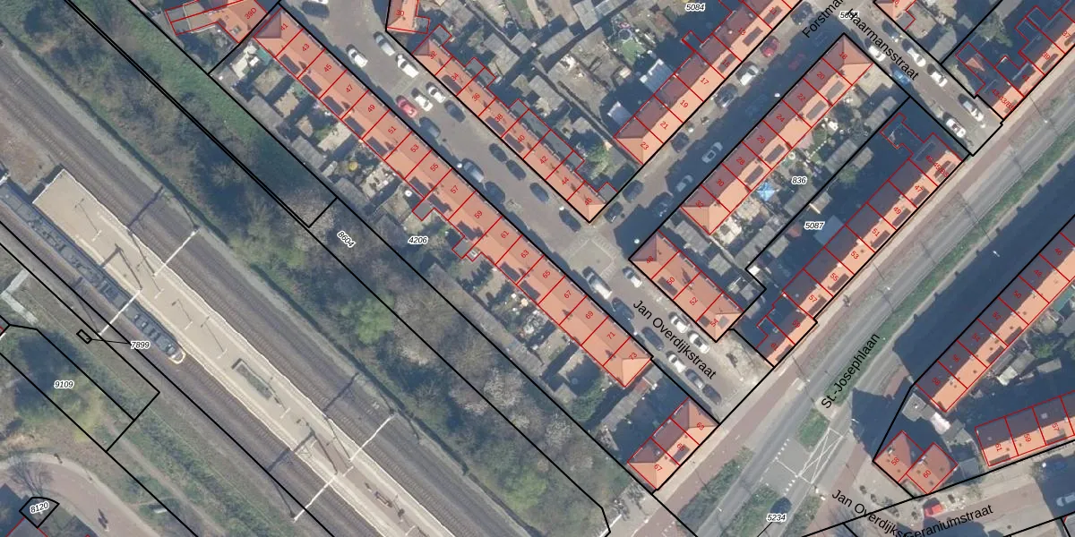 Het perceel waarop Jan Overdijkstraat 65 staat heeft een oppervlakte van 2086 m². Dit is een zeer groot perceel. De perceeloppervlakte wordt geregistreerd door het Kadaster. Gedetailleerde informatie over de maten van dit perceel kunt u vinden in het rapport Kadastrale kaart met maatvoering van Jan Overdijkstraat 65.
