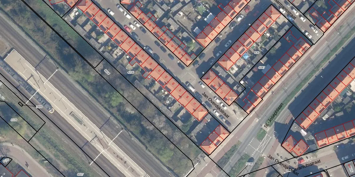 Het perceel waarop Jan Overdijkstraat 67 staat heeft een oppervlakte van 2086 m². Dit is een zeer groot perceel. De perceeloppervlakte wordt geregistreerd door het Kadaster. Gedetailleerde informatie over de maten van dit perceel kunt u vinden in het rapport Kadastrale kaart met maatvoering van Jan Overdijkstraat 67.