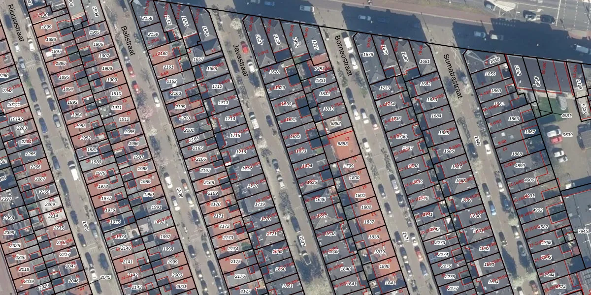 Het perceel waarop Javastraat 12 staat heeft een oppervlakte van 66 m². Dit is een klein perceel. De perceeloppervlakte wordt geregistreerd door het Kadaster. Gedetailleerde informatie over de maten van dit perceel kunt u vinden in het rapport Kadastrale kaart met maatvoering van Javastraat 12.