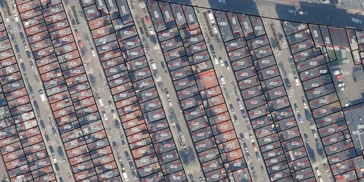 Het perceel waarop Javastraat 14 staat heeft een oppervlakte van 66 m². Dit is een klein perceel. De perceeloppervlakte wordt geregistreerd door het Kadaster. Gedetailleerde informatie over de maten van dit perceel kunt u vinden in het rapport Kadastrale kaart met maatvoering van Javastraat 14.