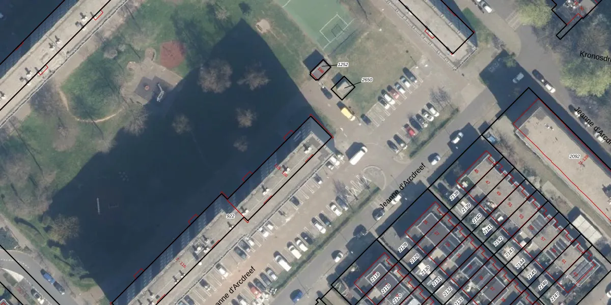 Het perceel waarop Jeanne d'Arcdreef 184 staat heeft een oppervlakte van 931 m². Dit is een groot perceel. De perceeloppervlakte wordt geregistreerd door het Kadaster. Gedetailleerde informatie over de maten van dit perceel kunt u vinden in het rapport Kadastrale kaart met maatvoering van Jeanne d'Arcdreef 184.