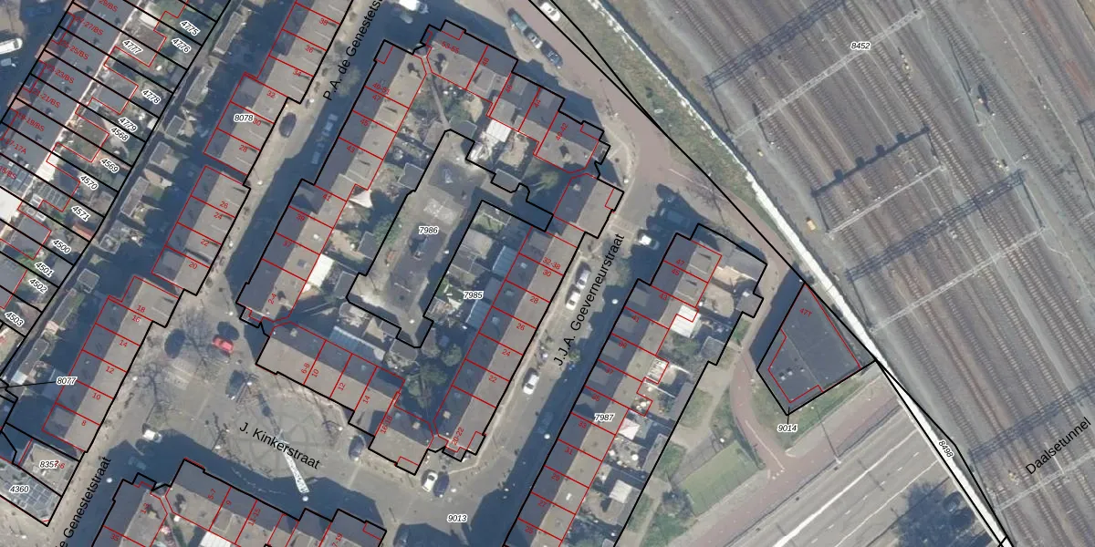 Het perceel waarop J.J.A. Goeverneurstraat 30 staat heeft een oppervlakte van 2860 m². Dit is een zeer groot perceel. De perceeloppervlakte wordt geregistreerd door het Kadaster. Gedetailleerde informatie over de maten van dit perceel kunt u vinden in het rapport Kadastrale kaart met maatvoering van J.J.A. Goeverneurstraat 30.