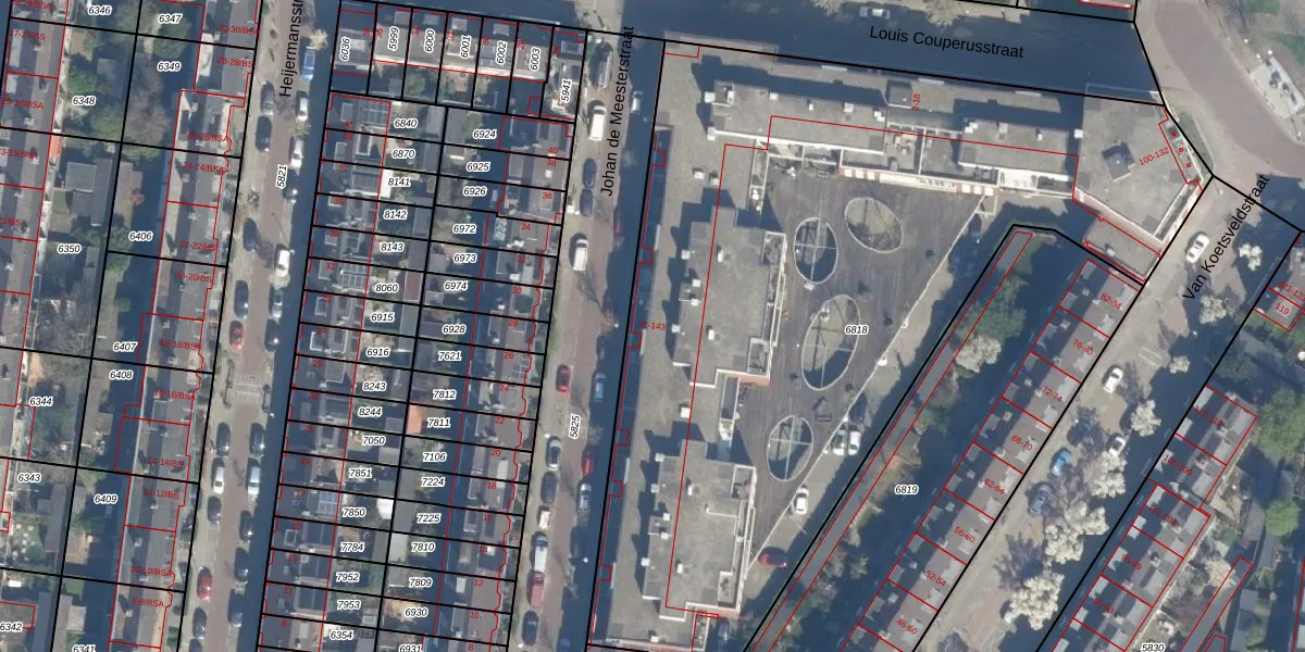 Het perceel waarop Johan de Meesterstraat 45 staat heeft een oppervlakte van 4682 m². Dit is een zeer groot perceel. De perceeloppervlakte wordt geregistreerd door het Kadaster. Gedetailleerde informatie over de maten van dit perceel kunt u vinden in het rapport Kadastrale kaart met maatvoering van Johan de Meesterstraat 45.