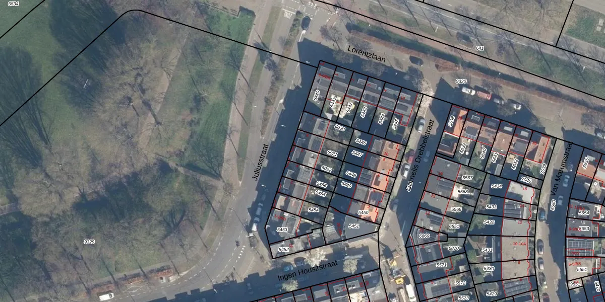 Het perceel waarop Juliusstraat 5 staat heeft een oppervlakte van 98 m². Dit is een klein perceel. De perceeloppervlakte wordt geregistreerd door het Kadaster. Gedetailleerde informatie over de maten van dit perceel kunt u vinden in het rapport Kadastrale kaart met maatvoering van Juliusstraat 5.