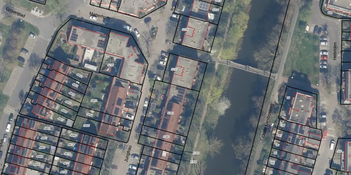 Het perceel waarop Jungfrau 110 staat heeft een oppervlakte van 700 m². Dit is een groot perceel. De perceeloppervlakte wordt geregistreerd door het Kadaster. Gedetailleerde informatie over de maten van dit perceel kunt u vinden in het rapport Kadastrale kaart met maatvoering van Jungfrau 110.