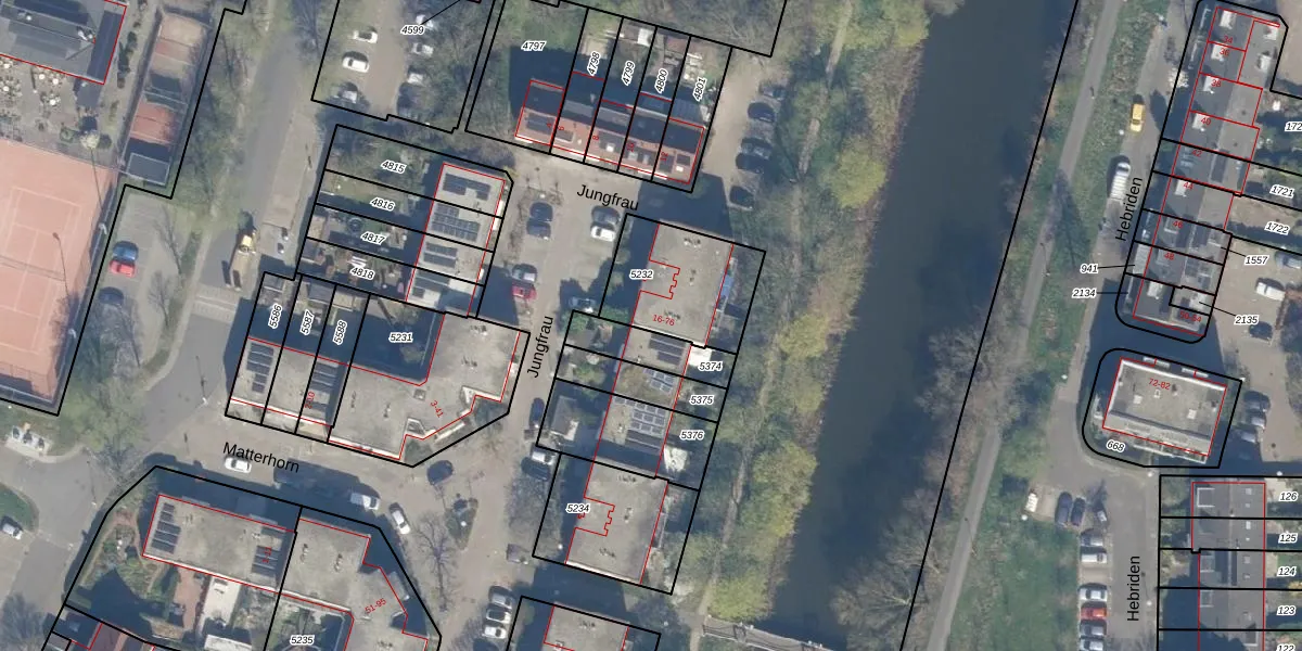 Het perceel waarop Jungfrau 24 staat heeft een oppervlakte van 364 m². Dit is een groot perceel. De perceeloppervlakte wordt geregistreerd door het Kadaster. Gedetailleerde informatie over de maten van dit perceel kunt u vinden in het rapport Kadastrale kaart met maatvoering van Jungfrau 24.